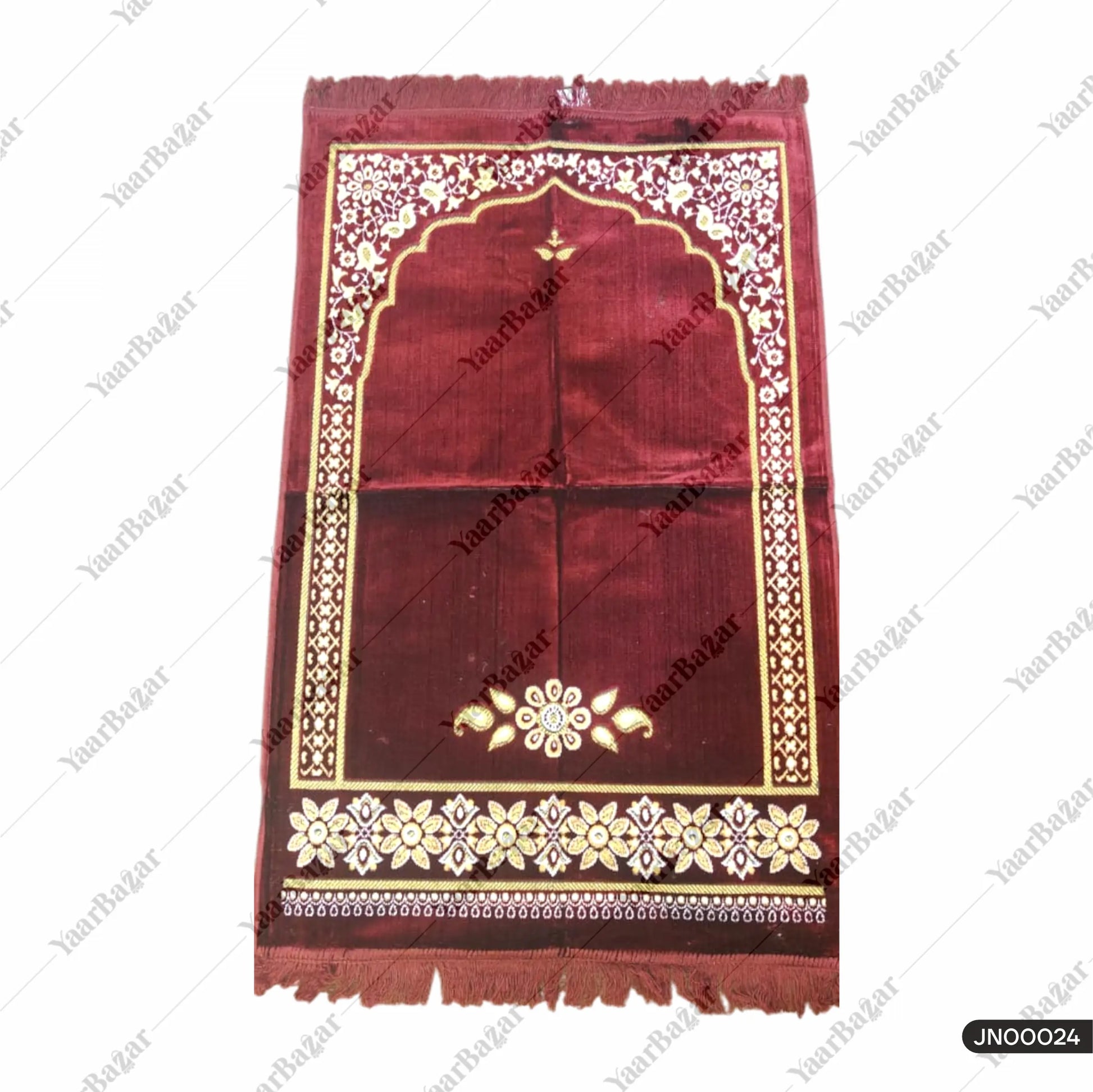 This Maroon Janamaz Prayer Mat combines elegance, comfort, and spiritual devotion. Crafted from high-quality fabric, it features a floral border that enhances its beauty, along with an arch design symbolizing the Mihrab. Its soft texture ensures comfort during prayers, while the rich maroon color adds sophistication. Lightweight and portable, this mat is perfect for use at home, in the mosque, or while traveling. It also makes a thoughtful and graceful gift for loved ones.